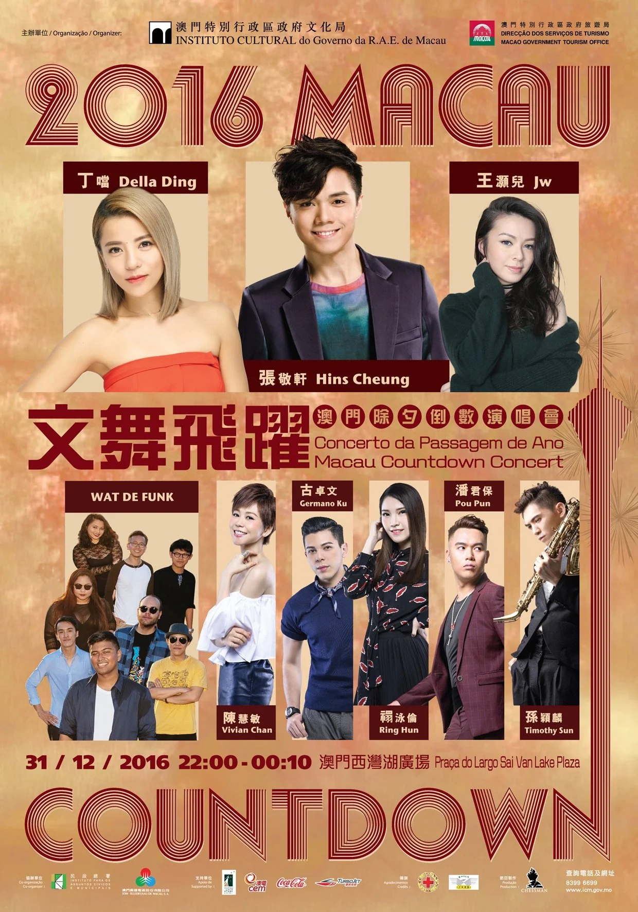 本年的“澳門除夕倒數演唱會”於2016年12月31日晚上十時在西灣湖廣場舉行,以“文舞飛躍”為主題,演唱會將分別由來自台灣及香港的實力派歌手丁噹、張敬軒、JW,連同一眾本地音樂人包括陳慧敏、古卓文、禤泳倫、潘君保、孫穎麟及樂隊Wat De Funk,為觀眾帶來別出心裁的歌舞演出。