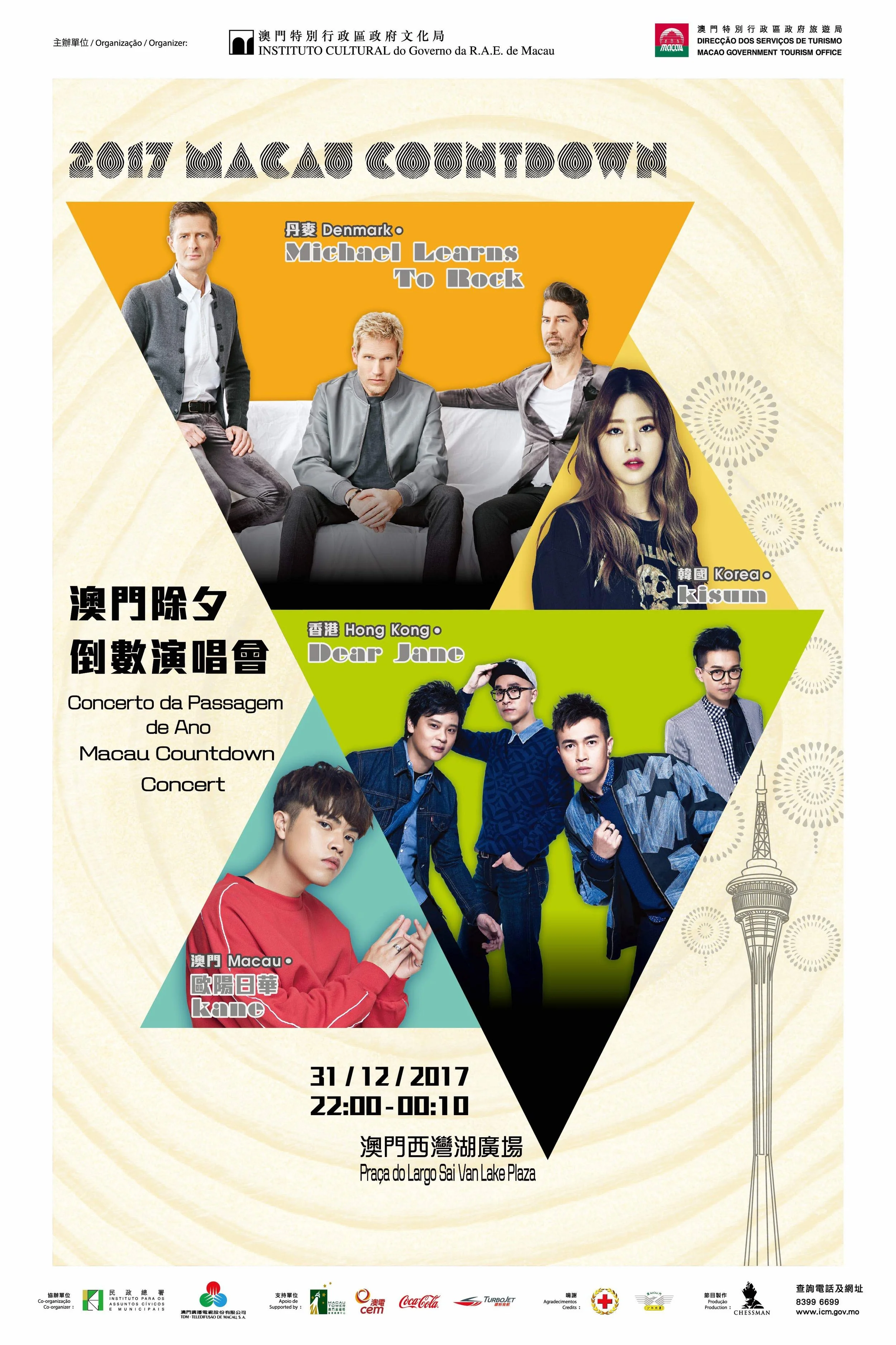“澳門除夕倒數演唱會”將於12月31日晚在西灣湖廣場舉行,來自丹麥的殿堂級組合 Michael Learns To Rock,將為觀眾送上多首經典金曲,還有香港人氣組合Dear Jane、新進人氣大熱韓國饒舌女歌手Kisum連同本澳歌手歐陽日華,以歌聲、音樂及舞蹈與市民共同迎接新一年的蒞臨。