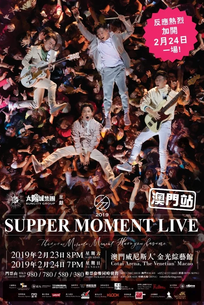 2018年Supper Moment 曾到中國多個城市進行巡迴演唱會,包括北京、上海、成都、長沙、廣州、中山、深圳、東莞和珠海,更剛於11月初完成了一連三場坐無虛席的香港演唱會。 Supper Moment於2006年成立,今年已踏入他們成軍的12週年。樂隊成員包括主音及結他手陳仕燊(Sunny)、低音結他手張祖光(CK)、結他手梁燿鵬(Martin)和鼓手陳鴻達(Hugh)。 樂隊連續四年獲得香港商業電台叱吒樂壇我最喜愛的組合,及於2018年獲得叱吒樂壇組合金獎。踏入2018 年,他們亦推出了最新大碟《dal segno》,備受媒體朋友和歌迷的一致推薦讚賞。是次澳門演唱會,Supper Moment 將唱盡新碟多首歌曲,及經典作品如「無盡」、「幸福之歌」和「風箏」等。