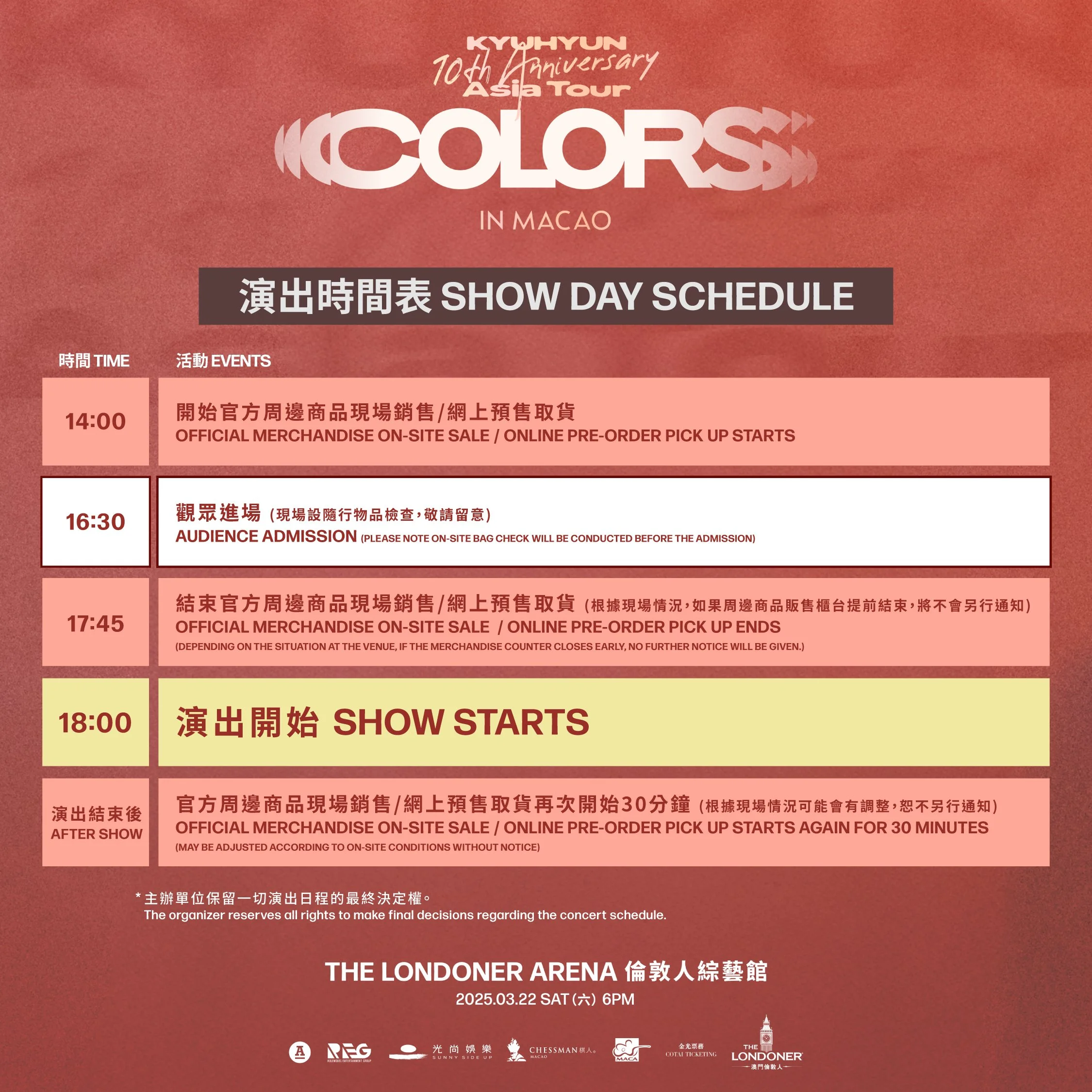 請大家留意 KYUHYUN 10th Anniversary Asia Tour 'COLORS' in MACAO 的演唱會日程,提早準備好當日行程,準備好與圭賢一起迎接充滿難忘旋律和純粹魔力的夜晚吧!💘